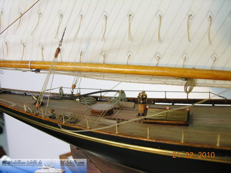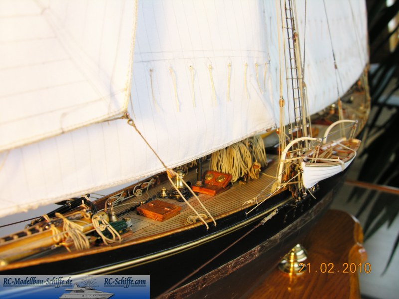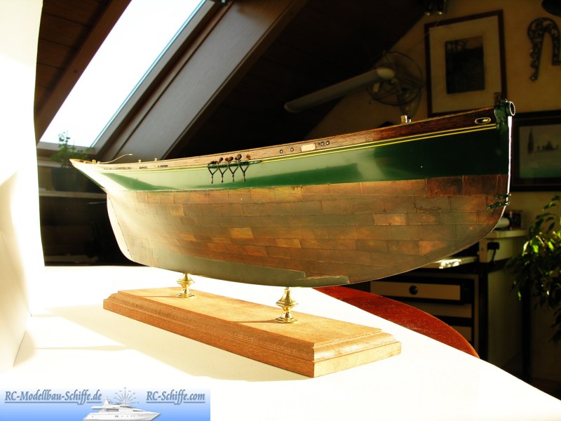 | Besonderheiten | Baubericht: Nachdem ich den Verteidiger des A.C. von 1885 „PURITAN“ nach einem Plan von Mamoli, der sehr bescheiden in den Details ist und einer umfangreichen Recherche, in 1:50 gebaut hatte, reizte mich der Bau des Herausforderers, des englischen Kutters „GENESTA“. Leichter gesagt als getan, denn ich fand weder in den Staaten noch in England irgend welche Pläne oder Unterlagen, USA lediglich ein paar Fotos. Es gibt, so viel ich weiß, nur ein Modell im New York Yacht Club, leider nicht zu fotogra- fieren. Durch Zufall fand ich in Falmouth-Cornwall ein Buch über das Yachtwesen in den von William P. Stephens, „Tradition & Memories of American Yachting“, dort fand ich den Linienriß und einen Querschnitt mit den Decks- aufbauten, auch die Maße des Riggs. Damit hatte ich genug Information um eine identisches Modell in 1:50 zu bauen. Den Rumpf baute ich mit 2x5mm Kiefernleisten auf Sperrholzspanten, innen mit Epoxyd fixiert. Den Rumpf als Finish mit Srayspachtel einsprühen und naß schleifen. Englische Holzyachten waren damals noch mit Kupfer beschla- gen ( amerikanische wurden mit einer Blei-Graphitmischung eingerieben ), also besorgte ich mir Kupfertape und schnitt daraus die vielen Platten. Für die Darstellung der Nägel, baute ich aus einem feinen Uhrenzahnrad eine Rändelvorrichtung. Nach dem aufkleben (man fängt unten an), mit Aceton reinigen und, wenn man will, mit einem Brünniermittel beizen, sieht mei- ner Meinung nach lebendiger, echter aus. Fürs Deck nahm ich 1.5 x 1.5mm helle Nussbaumleisten, als Kalfaterung eignet sich sehr gut Elektrikertape. Das Deckslayout entnahm ich der Zeichnung und von Fotos. Das Rig ist ein Cutter Rigg, soweit kein Geheimnis. Allerdings sollte man berücksichtigen, daß auf den Racern der Zeit grundsätzlich während der Segelei die Stenge gefiert werden konnte (der Grund für den Sieg der PURITAN), also sollte man das Stengewindrep eingeschert haben und berücksichtigen, daß die Stenge- wanten und das Stengestag nach dem Fieren der Stenge durchgesetzt werden können, das Gleiche gilt auch für den Bugsprit und sein Geschirr, der während der Fahrt rein und raus gefahren werden konnte. Für die Vorsegel kann man auch je ein Fall mehr anbringen, da ja ständig Segel gewechselt wurden. Für den Mast, Bäume und Spieren ist Linde ein feines Holz, keine Äste, kaum Maserung, gut zu beizen. Alle Beschläge an Deck und Rigg aus Messing , Blöcke individuell aus Birne gefertigt, Segel aus sehr feiner Baumwolle mit stark verdünnter Akrylfarbe gefärbt, mit Bleistift die Bahnen aufgezeichnet und mit Lieken versehen. GENESTA ist eine typisch englische „plank on edge“ Yacht, also extrem schmal und sehr tief (LaD 29,5 x B 4,5 x T 4,2 ) gezeichnet von J. Beavor Webb 1885. Für einen geübten Modellsegler könnte dieses Schiff doch einen Reiz haben. |