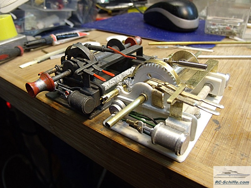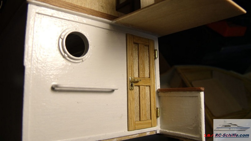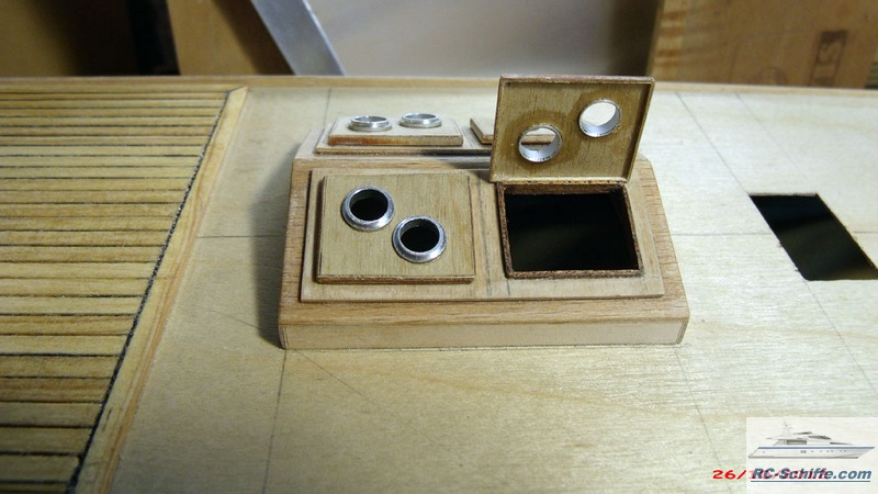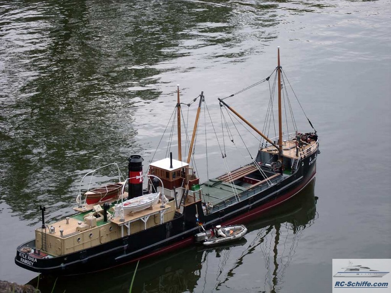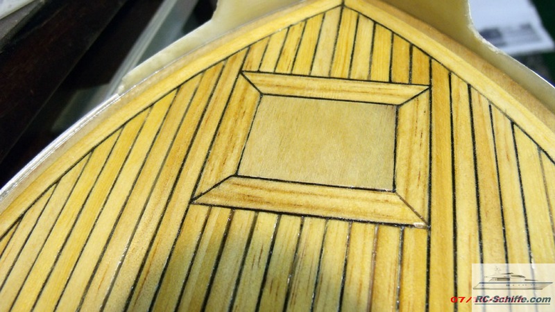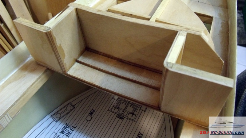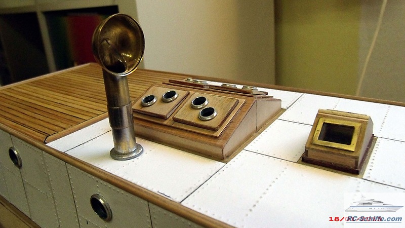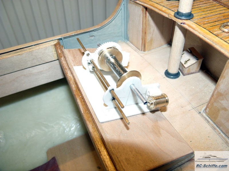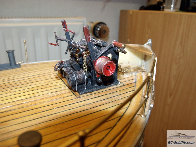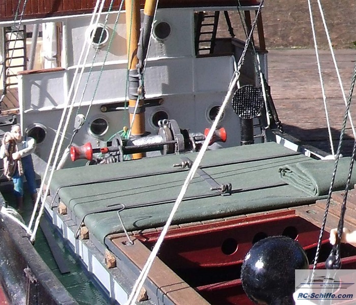 | Tipps für den Bau | Der GfK-Rumpf und der Plan ist aus England "modelbydesign" leider mit angeformter Wallschiene dafür aber keine Struktur in der Außenhaut. Der Plan ist leider nur sehr einfach ohne Maßhaltikkeit oder Details, die verschiedenen Ansichten weichen ab. Im www-Netz gibt es einige Bilder von dem oder baugleichen Schiffen so dass man einige Details übernehmen kann. Achter- und Vorsteven wurde aus 2mm Alu eingesetzt. Das Deck und die Aufbauten sowie die Luke ist aus Sperrholz. Das Deck ist im Wohnbereich beplankt und mit Zwirnsfaden kalfatert/"Glu" vergossen. Die Seeforten, die Ankerwinde und die Deckswinden und weitere Beschläge sind eine Eigenkonstruktion, Die Schlingerkiele sind aus Alu 10x10x1 T-Profil und mit 2mm Schrauben mit der Außenhaut verschraubt. |