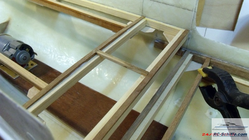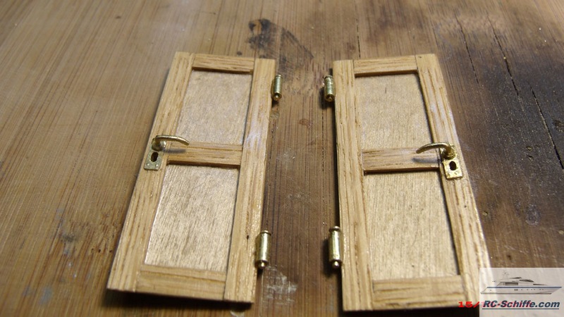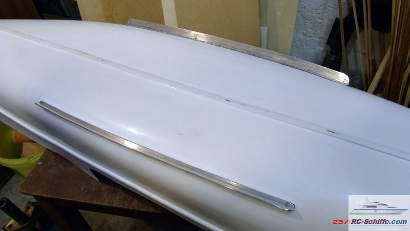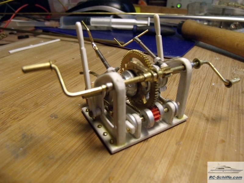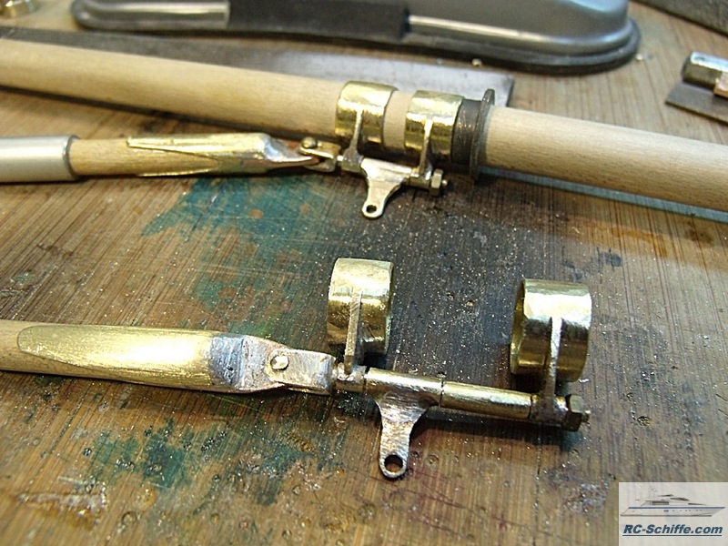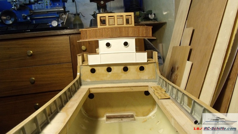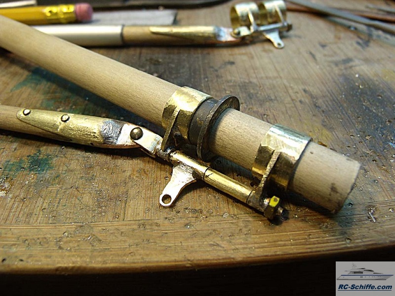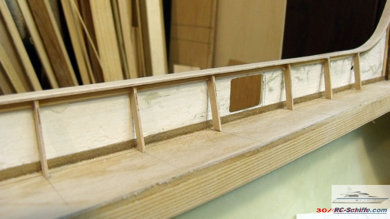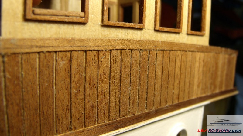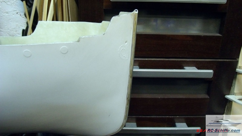 | Tipps für den Bau | Der GfK-Rumpf und der Plan ist aus England "modelbydesign" leider mit angeformter Wallschiene dafür aber keine Struktur in der Außenhaut. Der Plan ist leider nur sehr einfach ohne Maßhaltikkeit oder Details, die verschiedenen Ansichten weichen ab. Im www-Netz gibt es einige Bilder von dem oder baugleichen Schiffen so dass man einige Details übernehmen kann. Achter- und Vorsteven wurde aus 2mm Alu eingesetzt. Das Deck und die Aufbauten sowie die Luke ist aus Sperrholz. Das Deck ist im Wohnbereich beplankt und mit Zwirnsfaden kalfatert/"Glu" vergossen. Die Seeforten, die Ankerwinde und die Deckswinden und weitere Beschläge sind eine Eigenkonstruktion, Die Schlingerkiele sind aus Alu 10x10x1 T-Profil und mit 2mm Schrauben mit der Außenhaut verschraubt. |