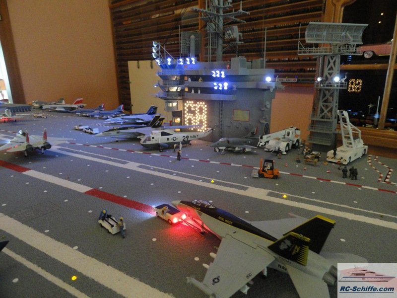 | Besonderheiten | 14 Antennen hoch und runterfahrbar, 6 Radar drehbar, 3 Raketenwerfer drehbar, Anker fallen lassen und reinholen, Hubschrauber Rotoren drehbar, Soundmodul, Jede Menge Licht: Komandoturm: 68 beleuchtet, Suchscheinwerfer, Arbeitsleuchten, 48 LED's, Navigationslicht (Lauflicht), Innenbeleuchtung, Toplicht, Radarturm: Suchscheinwerfer, Landedeck: Lauflicht, Startkanzel, Hubschrauberkanzel, 2 Flugzeuge mit Düsenbeleuchtung plus Positionslicht, 2 Autos mit Beleuchtung, Rumpf: Landekreuz (Meatball), Plattformen Raketenwerfer, Klüsen, Hangerbeleuchtung, Schweizlicht, Versorgunsplattform und Lüfterbleche beleuchtet, sämtliche andere Plattformen sind beleuchtet. |