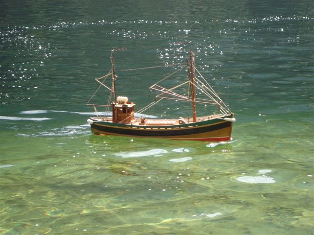Klassische Spantenbauweise, Doppelbeplankung, alles Holz - auch das Ruder, Takellage mit Gummischnüren, Ausgebaues Steuerhaus mit Beleuchtung abnehmbar, Dieselgeräusch, Ladeluke abnehmbar |