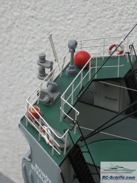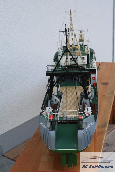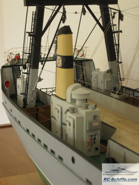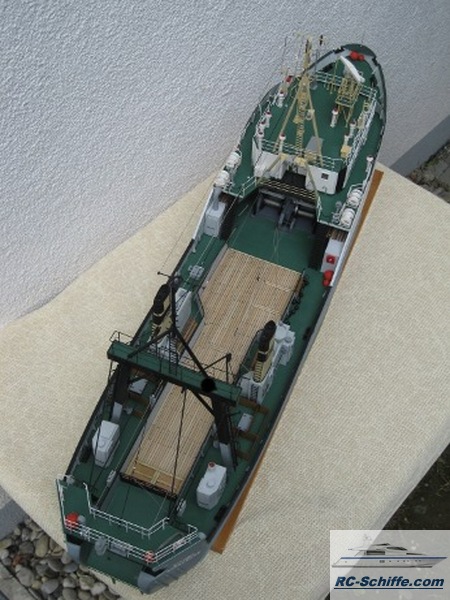 | Besonderheiten | Bauwerft Elbewerft Boizenburg, Baujahr 1968 , gebaut nach Werftzeichnungen Der Rumpf ist in klassischer Bauweise auf Spant mit Leisten beplankt und mit Glasgewebe und Polyesterharz beschichtet. Die Besonderheit bei diesem Schiff ist das Dreiflächen - Ruder Bauart Jaenckel (Siehe hierzu Artikel in 9/2012 Schiffsmodell). Das Modell ist als Fahrmodell F2 ohne weitere Sonderfunktionen ausser Beleuchtung ausgestattet. |
