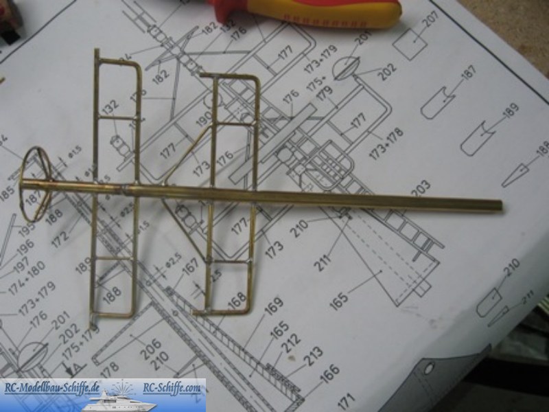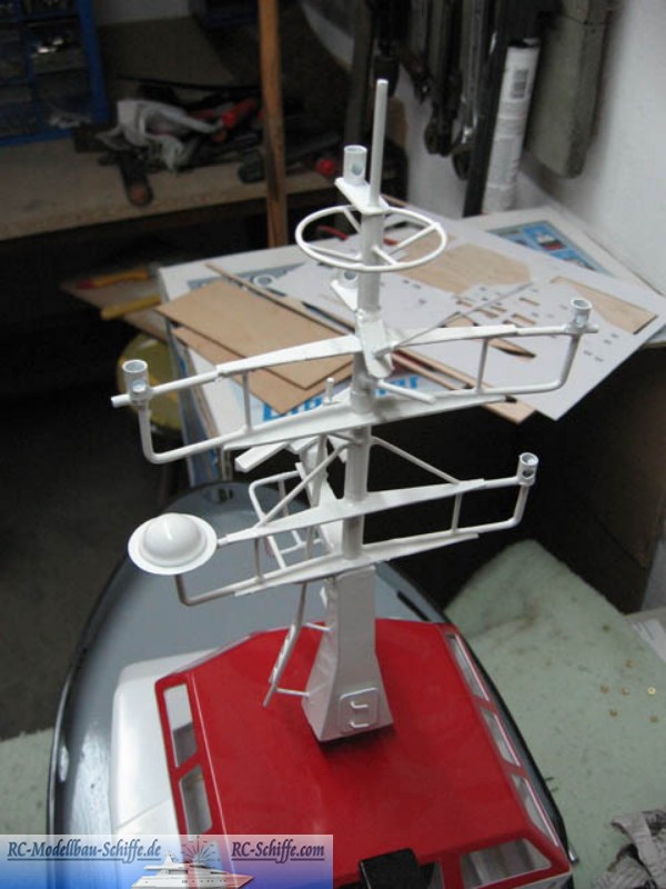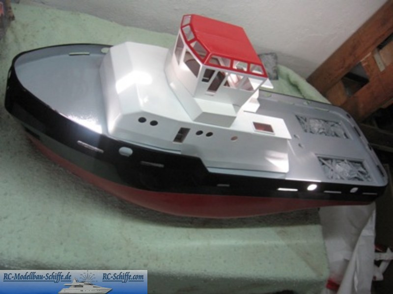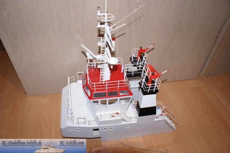 | Tipps für den Bau | Nur nach Technischem Bauplan arbeiten und alles gründlich durchlesen bevor man anfängt. Manches ist nicht erklärt und bedarf fundierter Modellbaukenntnisse. Geschick im Bau und im der Improvisation sind gefragt. Teile sind nicht immer passgenau und es empfiehlt sich, dass Deck mit einem Silikonkleber oder Heute auch mit Pattex Bombenfest oder Kraftkleber anzubringen, da dieser Kleber extrem fest und Wasserdicht ist. Mit einem 2 Komponentenkleber würde man viel zu lange brauchen und da wäre der erste Strang schon wieder fast fest ehe man das komplette Deck verkleben kann. Die Holzskelettkonstruktion im Rumpf muss nicht genau nach Bauplan erfolgen man kann da auch sehr frei arbeiten. Die Motoren habe ich mit der Mitgelieferten Alu Motorhalterung verbaut und die Motorhalterung fest mit dem Holz verklebt und verschraubt. Im Deck sind normalerweise 3 Öffnungen für Wartungsarbeiten. Diese sollten eigentlich verschraubt werden, das habe ich komplett anders gemacht. Ich habe die Öffnungen durch 1mm starkes Edelstahlblech ersetzt und habe einen Magnetverschluss angebracht. Starke Zylindermagnete im Deck für die kleinen Öffnungen jeweils 6 für die große 8. Starke Magnete auf dem Edelstahlblech verklebt und unter das Edelstahlblech eine Schicht Selbstklebendes Moosgummi. Tests haben ergeben, dass kaum Wasser ins innere kommt, bzw. garkein Wasser, aber Mossgummi saugt ein bisschen Wasser an. Keinerlei Beschädigungen im Rumpf kein Wassereintritt und zu 100% Wasserdicht! Schnelles Öffnen der Schächte ist hier möglich normal müsste jedesmal geschraubt werden... Für den Masten habe ich eine Spezialkonstruktion gemacht und die Lämpchen nicht auf die Stangen aufgeklebt sondern den unteren Teil der Lampe mit einem Alurörchen verklebt und dieses ist fest verlötet auf dem Mast. Ein kleines Loch im Alurohr sorgt dafür, dass man das Kabel der Lampe durchführen kann. Die verschiedenen Ebenen des Deckaufbaus habe ich nicht verspachtelt sondern mit Acrylmasse verklebt und die Ränder mit Spüli entfernt Acrylfugen sind eben auch überlackierbar. Lack ist komplett Wasserbasierend von Dupli Color. min. 2 Schichten Farbe und am kompletten Rumpf außen 4 Schichten Klarlack. Ein Bild vom fertigen Schiff wird nachgereicht, sobald ich dazu komme die restlichen Details noch abzuarbeiten! |