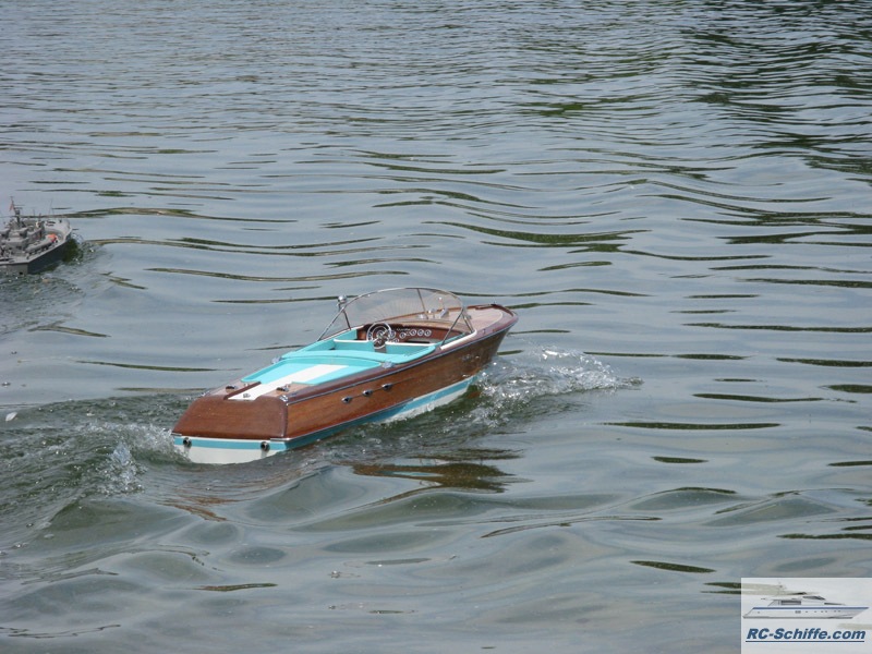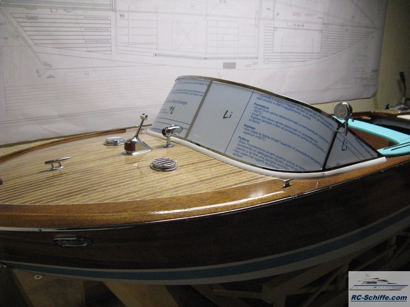 | Besonderheiten | Soundmodul für orginalen Riva-Sound, also das Starten beider Motoren und dann fahrgeschwindigkeitsabhänig. Beleuchtete Bug und Suchscheinwerfer und Hecklicht. Rumpf und Deck sind komplett aus Mahagoni. Der Rumpf ist ohne Unterbeplankung. Alle Teile sind mit Leder und Kunstleder bezogen. Der Frontscheibenrahmen ist aus 2mm Messing lasergeschnitten mit ausge- frästen Scheiben ausschnitten, dadurch liegen die Scheiben ohne Überstand in dem Rahmen. |